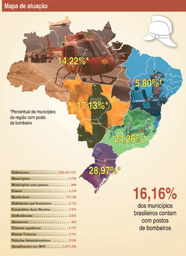 Pesquisa Cenário de Emergência – Bombeiros do Brasil identifica que o país possui postos de bombeiros em 16,16% dos seus municípios. O índice de cobertura é um pouco superior ao apurado em 2014, quando o serviço foi identificado em 14,51% das cidades brasileiras